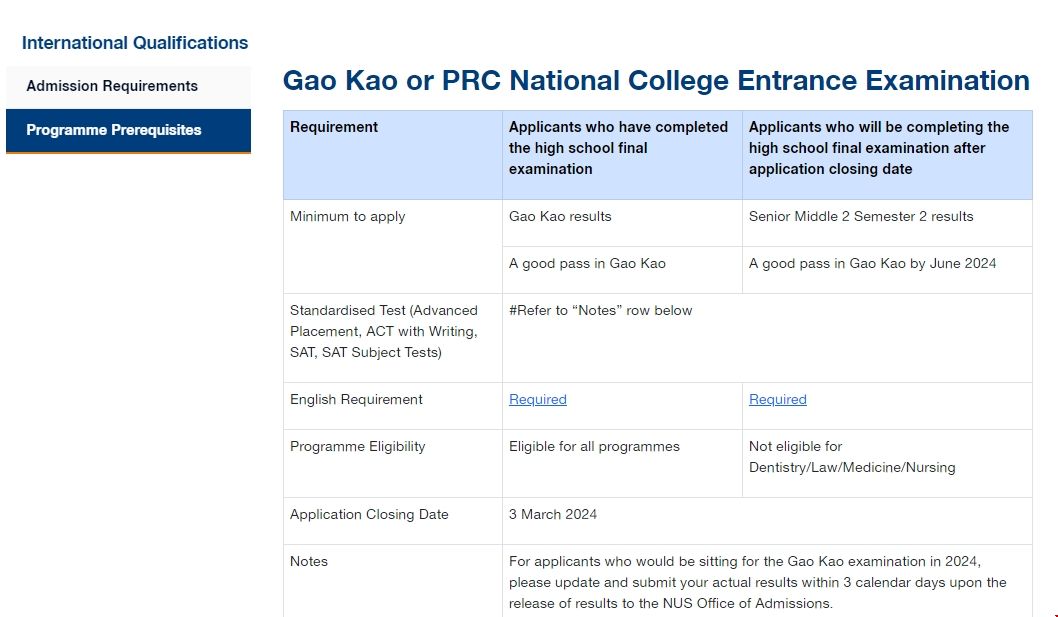(1)新加坡國立大學要求: